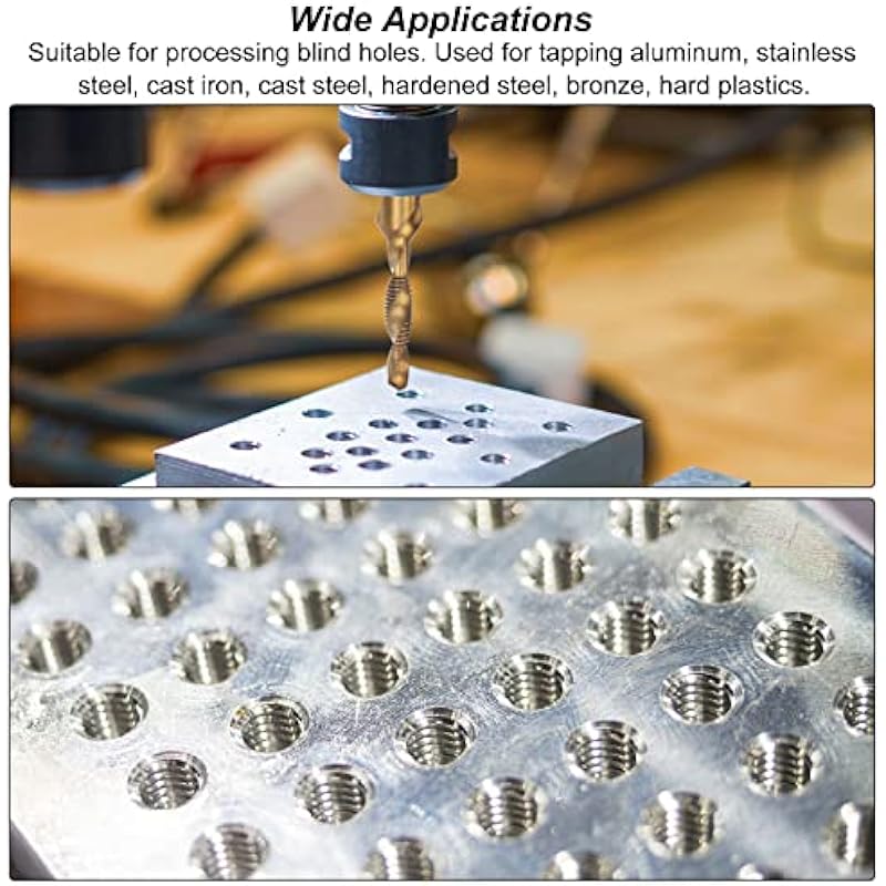 - Wide Applications: Suitable for processing holes. Used for tapping aluminum, die steel, stainless steel, bronze, hard plastics, etc.. Recommended feed rate: general steel: 6-15m/min; harder steel: 5-10m/min; stainless steel: 2-7m/min; cast iron: 8-10m/min.