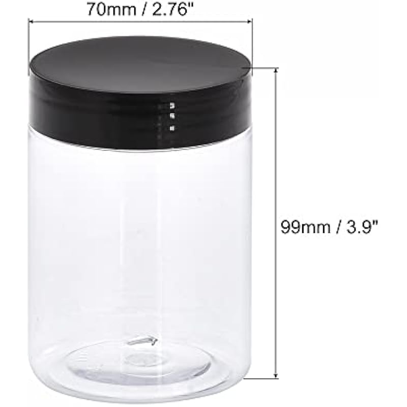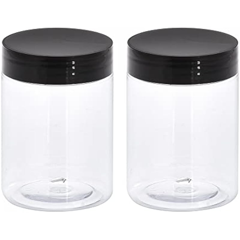 - [What You Get] – Package comes with 2Pcs of Clear Plastic Storage Jars with black screw top lids for your various needs: Capacity: 10oz/ 300ml; Dimension: 70mm x 99mm/ 2.76 x 3.9inch(OD*T)