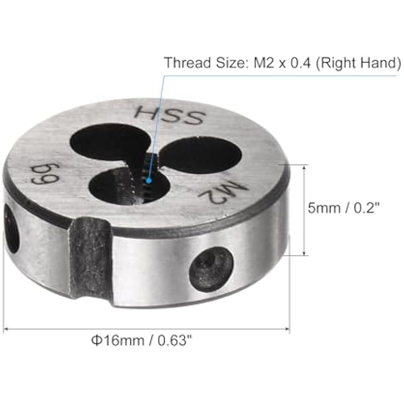 - Round Threading Die: Thread size: M2 x 0.4 (right hand); outside diameter: 16mm / 0.63″; thickness: 5mm / 0.2″; accuracy class: 6g. Made of M2 (6542) high-speed steel, it has high hardness, good toughness, wear resistance, and excellent cutting performance.