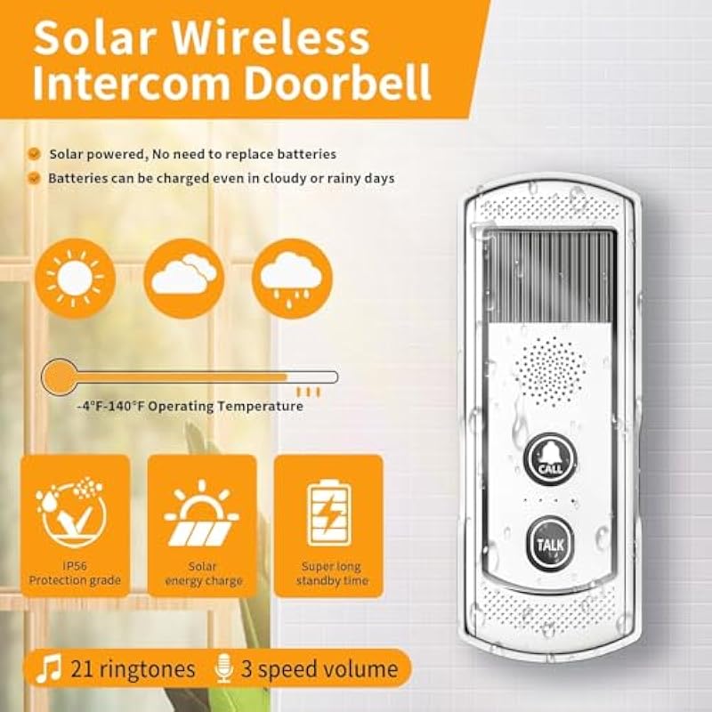 - 🔋Solar-Powered Design: Both the indoor and outdoor units have built-in 1800mAh rechargeable batteries. The outdoor unit can be solar-powered, eliminating the need to worry about running out of power.