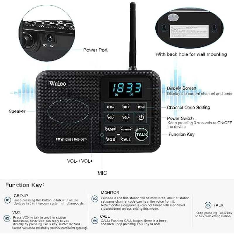 - [ Easy to Use with Detailed Manual ] Features include Monitor, Talk, VOX (Voice Operated Exchange), Group, and Calling function. Increase/lower volume, power switch, display screen too! This intercom system is easier to use than others with user-friendly multi-functions and included step-by-step instructions!