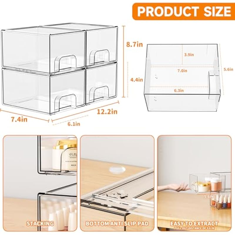| Usage | Clear Stackable Storage Drawers,Acrylic Drawers Storage Boxes,Bathroom Organization and Storage,Plastic Makeup,Medicine Organizer,Storage Bins for Cabinet,Shelves,Undersink |