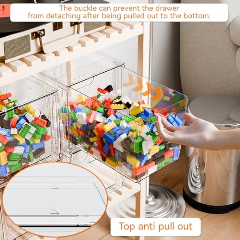 - 【Easy to Install/Pull Out】this acrylic drawers just insert the 4 brackets to complete the installation, and remove them by pulling them out. The process only takes 30 seconds,And equipped with anti slip pads, making the drawer slide out for better use,the drawers equipped with a shut-off valve To prevent the drawer from completely pulling out and causing it to fall off (if not needed, any tool can be used to remove it)